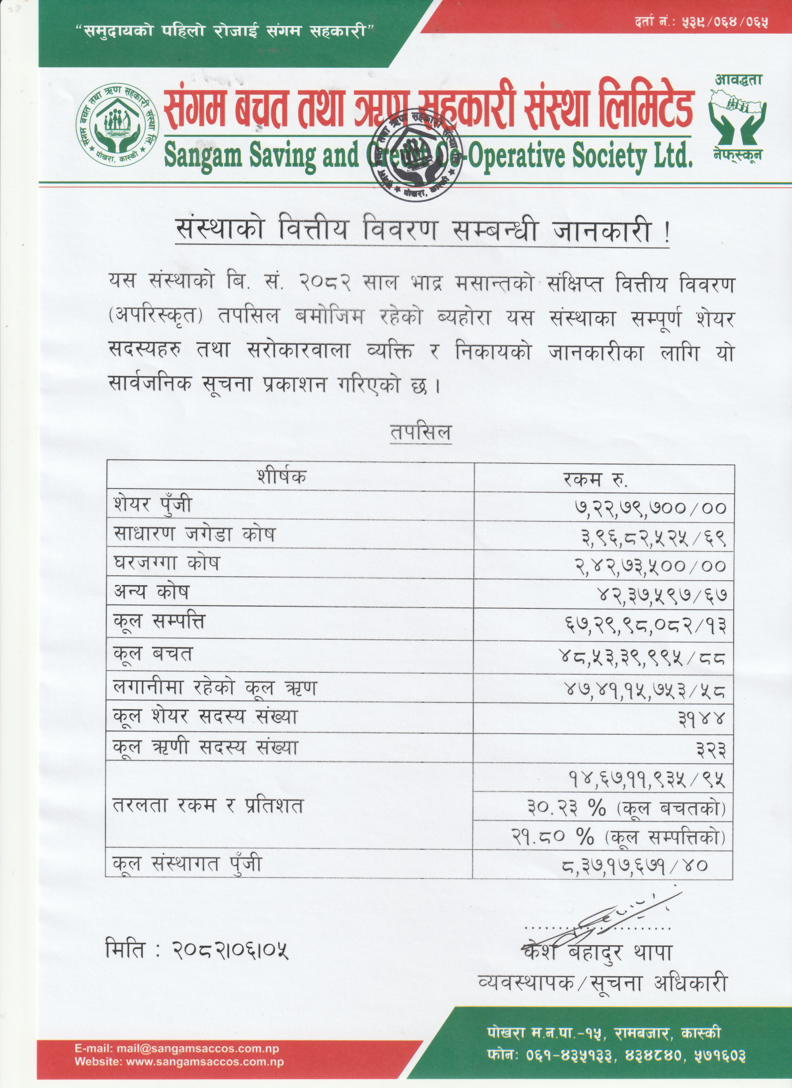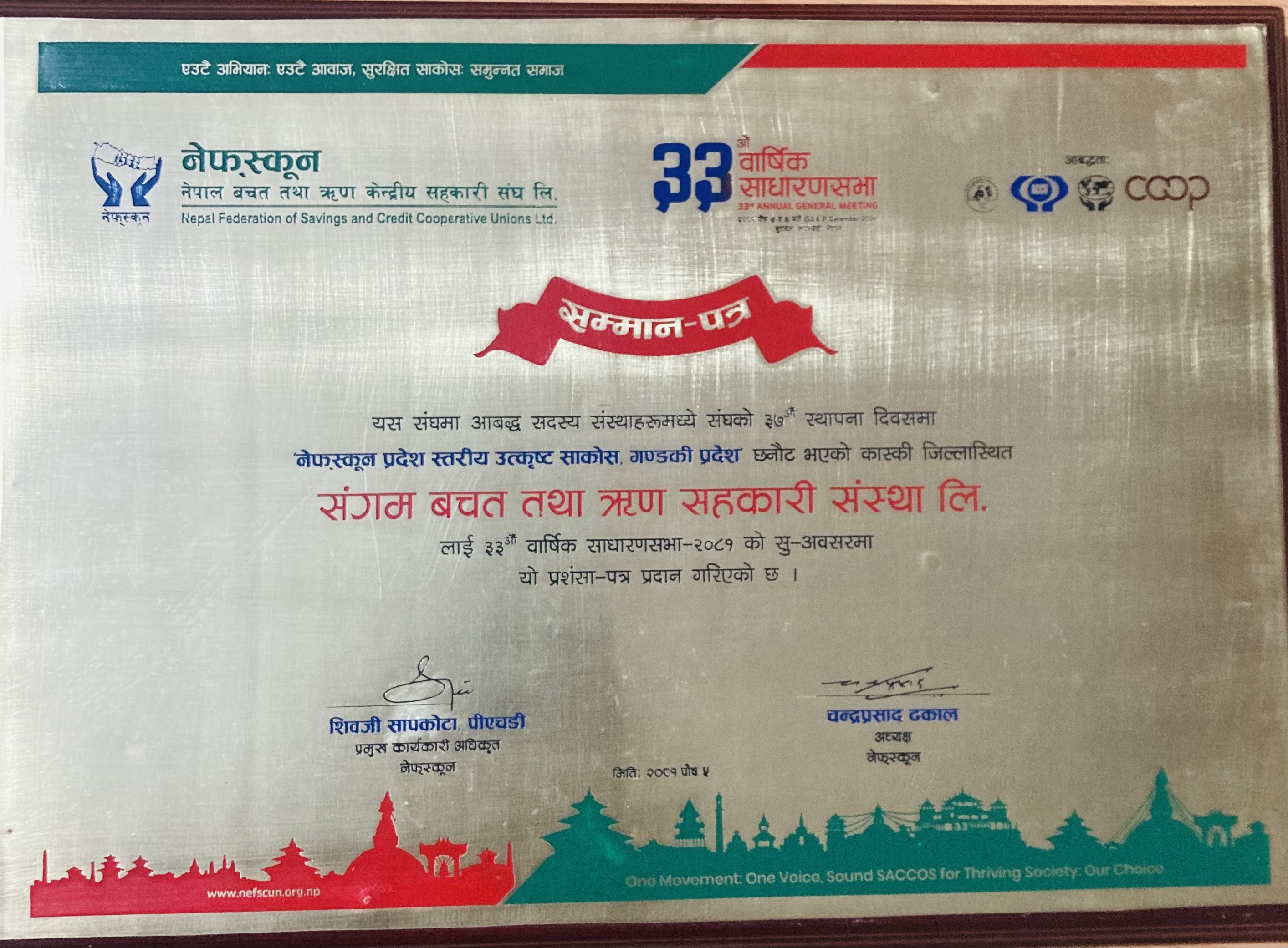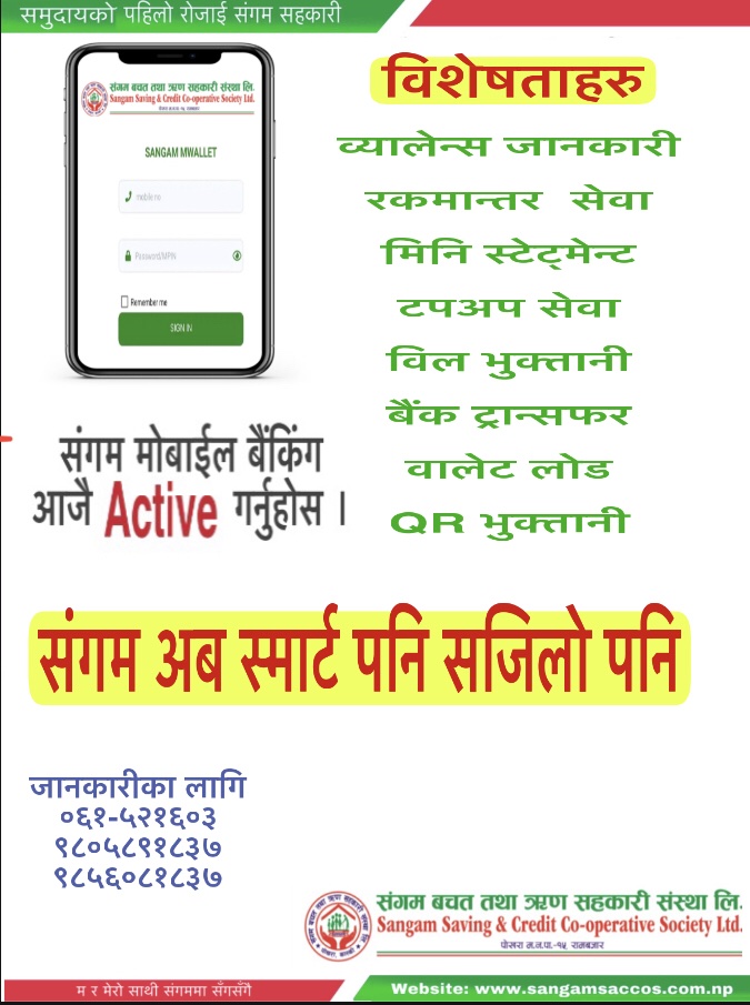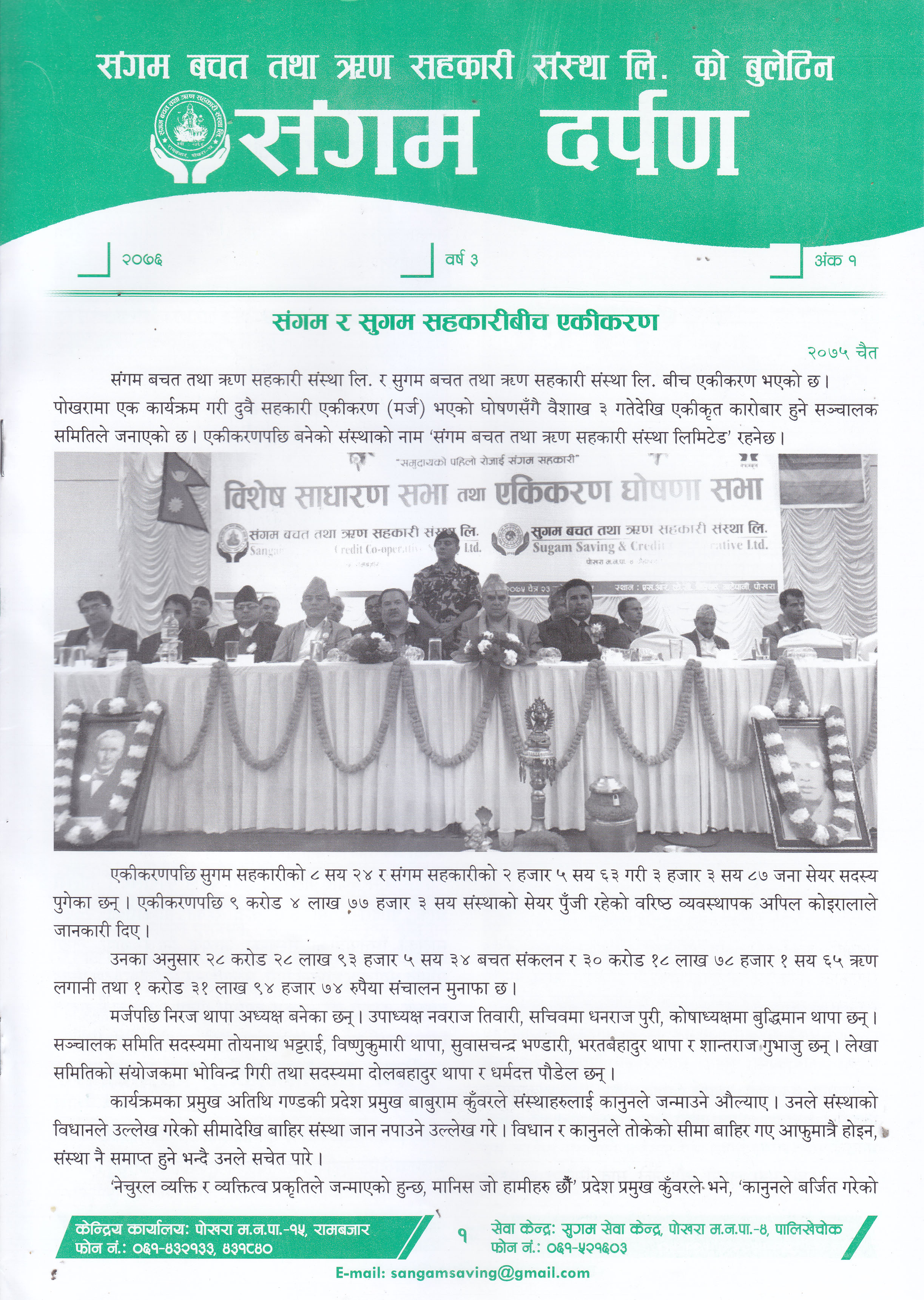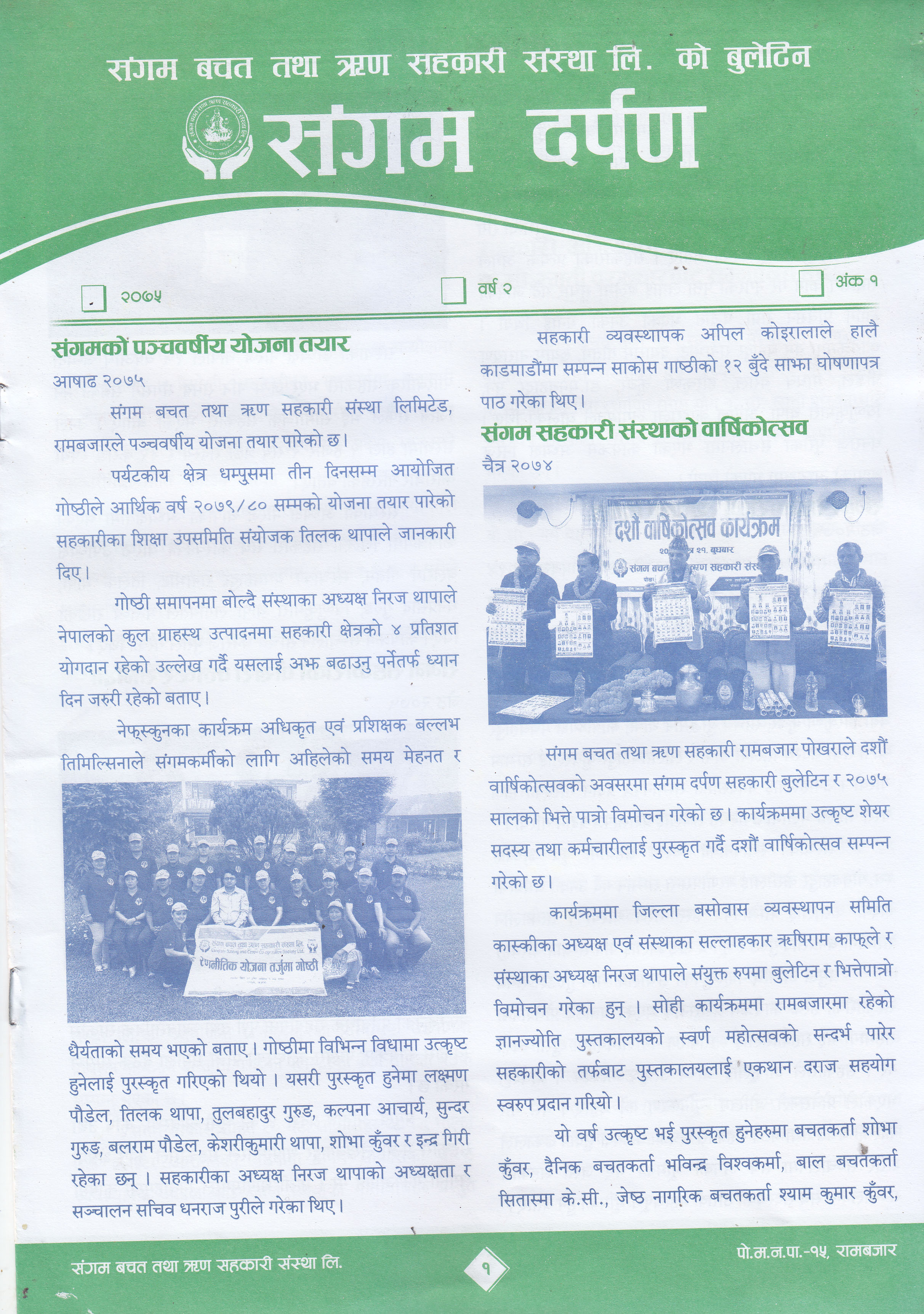 Sangam Saving and Credit Co-operative Society, located in Rambazar, Pokhara-15, was established in 1993 by a group of 34 people including teachers, peasants and social workers , The purpose of establishing this co-operative society was to fight against extreme poverty that existed in this area for hundreds of years and raise their socio economic status of people through self-help, self-reliance and solidarity among community members.