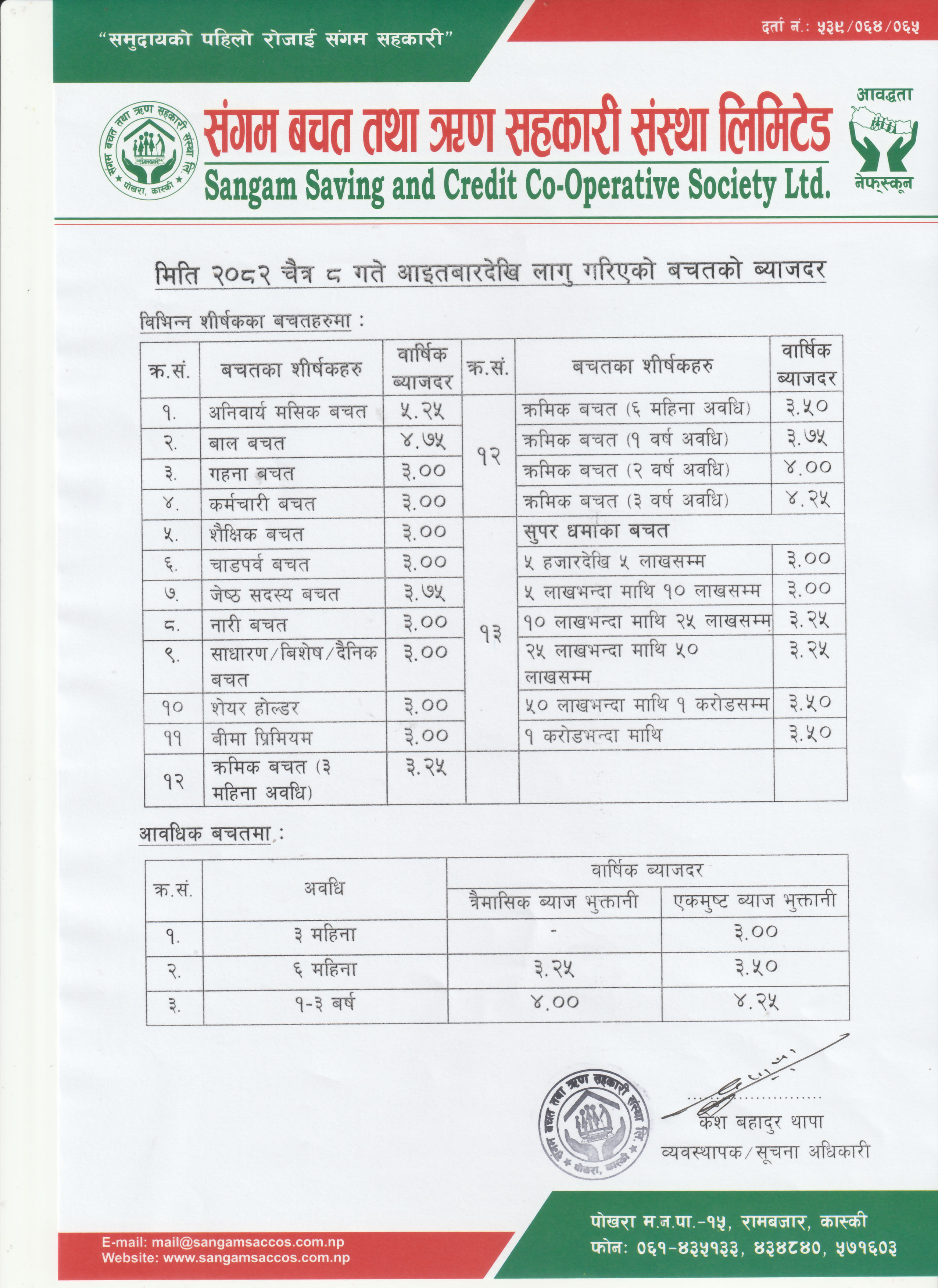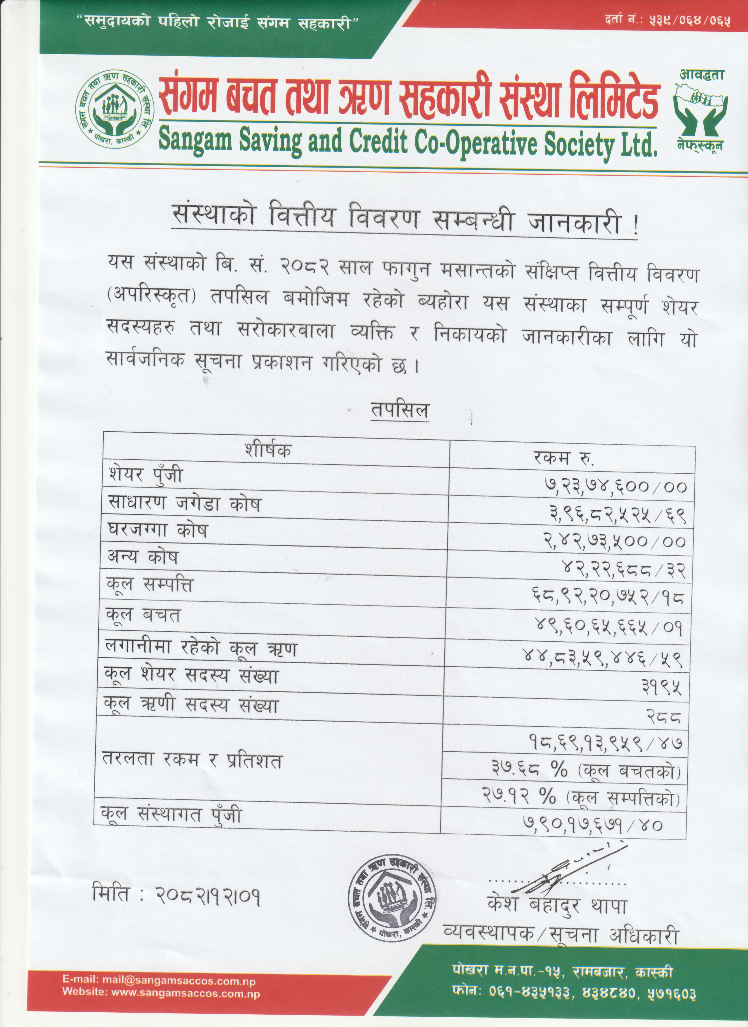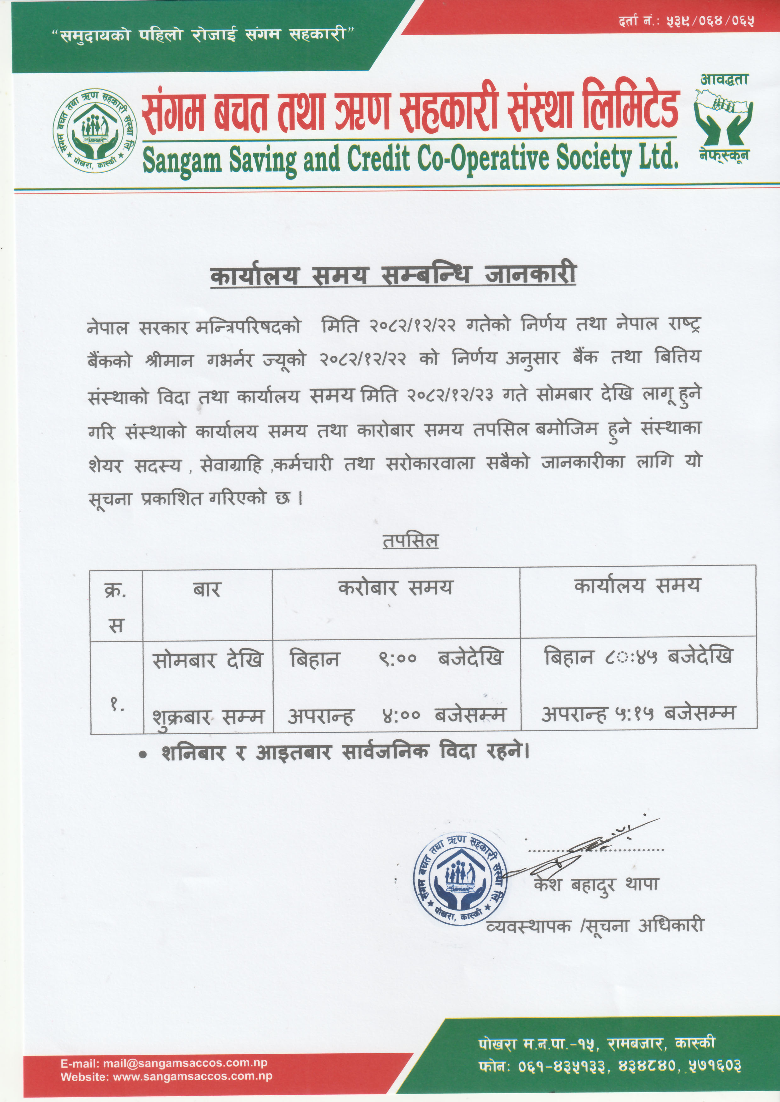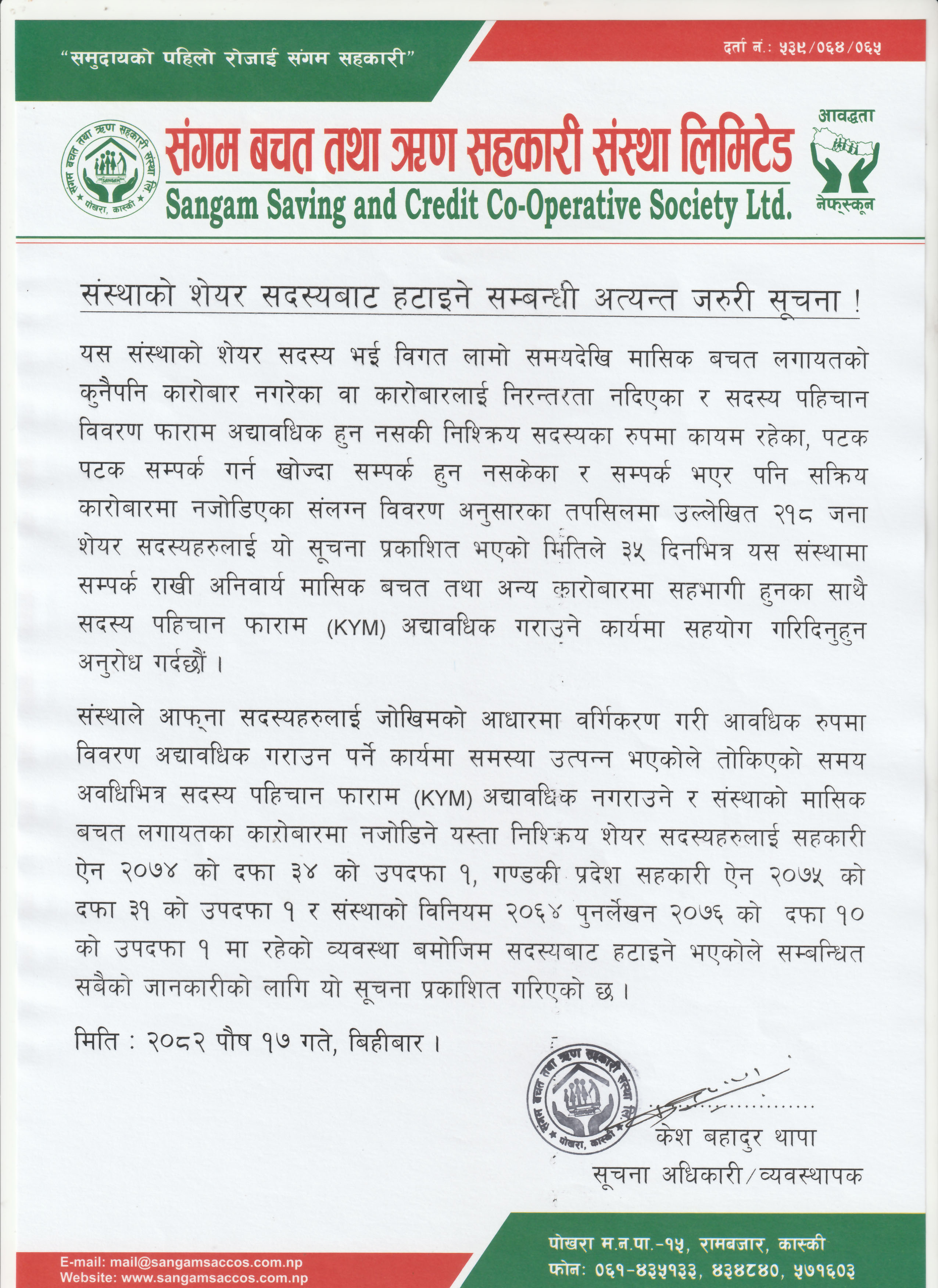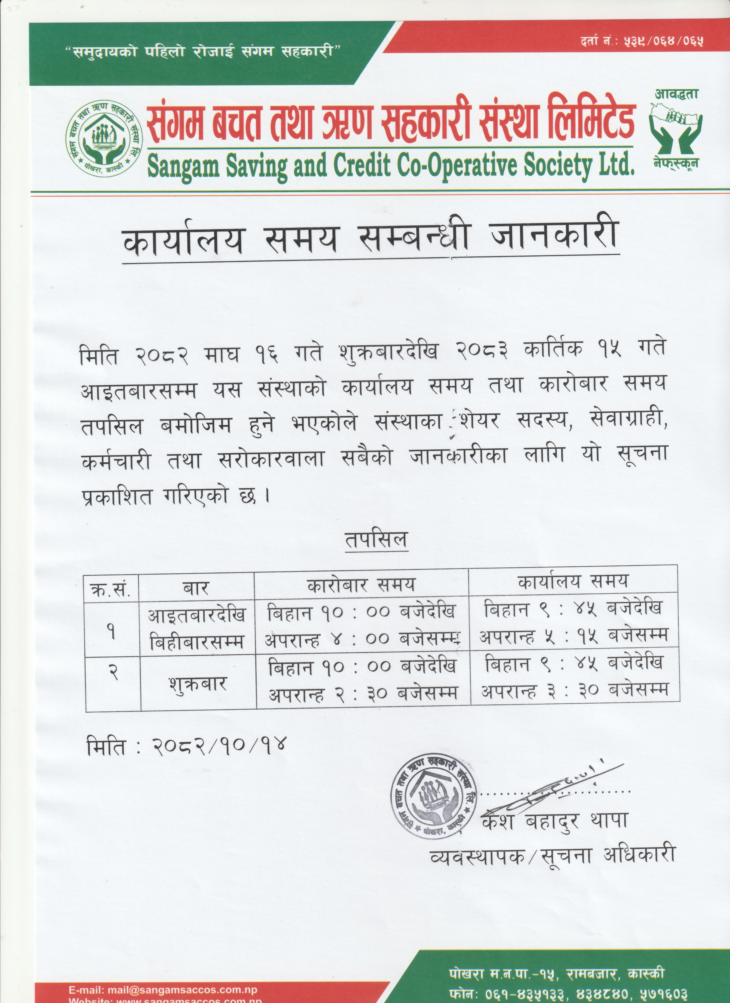Sangam Saving and Credit Co-operative Society, located in Rambazar, Pokhara-15, was established in 1993 by a group of 34 people including teachers, peasants and social workers , The purpose of establishing this co-operative society was to fight against extreme poverty that existed in this area for hundreds of years and raise their socio economic status of people through self-help, self-reliance and solidarity among community members.